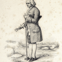 Portrait en pied de J. J. Rousseau à claire-voie, «herborisant à Ermenonville. Il est tourné vers la gauche ; il porte son tricorne sous le bras gauche, quelques fleurs dans la main droite, et tient sa canne de la gauche. L'habit est ouvert, le gilet boutonné.