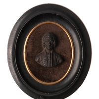 Petite médaille pour être suspendue à un ruban: portrait à la romaine de profil à gauche, tête nue et à droite, dates: 1878 à g., 1778 à dr. La pièce est rehaussée d'une branche de pervenches, feuillage vert et fleurs violettes.