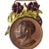 - Petite médaille pour être suspendue à un ruban: portrait à la romaine de profil à gauche, tête nue et à droite, dates: 1878 à g., 1778 à dr. La pièce est rehaussée d'une branche de pervenches, feuillage vert et fleurs violettes.
