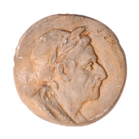 Médaillon en biscuit de Sèvres orné d'un profil de Rousseau à la romaine en bas relief, de profil à gauche, tête nue, coiffure à la romaine, toge à hauteur de poitrine. Diamètre : 140.