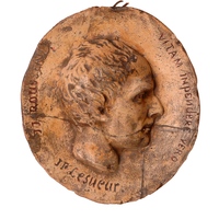 Grande médaille circulaire en bronze patiné, représentant le buste de Voltaire superposé à celui de Rousseau, de profil, regardant à gauche. Tous deux sont tête nue, en perruque. Sous l'épaule de Voltaire, date de 1823, diamètre : 170. Hauteur des bustes : 139,3, en haut relief.