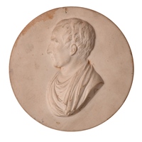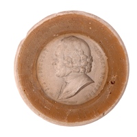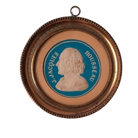 Médaillon rond, en plâtre, diamètre : 84, la médaille intérieure : 51, buste de profil à gauche, tête nue, perruque J.J. Rousseau Citoyen de Genève, signé : C. Richard f.