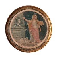 Médaillon ovale à suspendre, représentant Rousseau en pied, debout de profil à droite, appuyé sur sa canne, les bras croisés. Nu tête, en perruque, il regarde au loin, derrière lui, sur un terre-plein, il a posé un livre et son chapeau. Dans le fond un paysage d'arbres. La gravure est recouverte d'un verre bombé, inséré dans un cadre de bois noir formant cuvette, l'ovale entourant le verre est doré. Dimensions : env. : le personnage : 66, l'ovale gravé : 89, le tout : 180 x 153,3, épaisseur : 16. Buffenoir a inscrit : « Vigneron, artiste du 19e siècle (fin ?) »