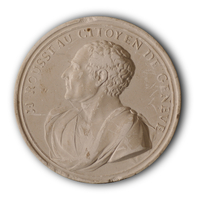 - Dans un médaillon rond en plâtre doré, avec suspente, portrait de Rousseau à la française, de profil à droite, tête nue, perruque, inscription en cercle autour de la gravure, dim. : diamètre : 48 : sous le portrait : J.J. Rousseau, le reste du cercle : Il rendit les enfans à la nature, les hommes à la liberté.