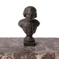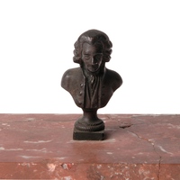 - Presse-papiers en marbre sombre; au centre est vissé un buste de Rousseau en fonte sur piédouche, de face, en habit français à trois boutons, tête nue, avec perruque.