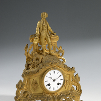 Pieds devant: 27 mm, hauteur du socle en marbre: 50 mm, profondeur: 120 mm, longueur: 250 mm, pan coupé: 50 mm. Au-dessus, une pièce de bronze ornée soutient un bloc de marbre noir (qui mesure: hauteur: 165 mm, longueur: 200 mm, profondeur: 90 mm) dans lequel on a inséré une pendulette, cadran, diamètre: 91 mm. La lunette arrière, diamètre: 113 mm. Plaquette supérieure: épaisseur: 7,5 mm, longueur: 205 mm, profondeur: 91 mm. Hauteur de la statuette: 235 mm. - id (dcterms:identifier)