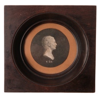 - Dans un cadre de bois ovale avec un ornement sculpté, style «graveur des ours bernois», entouré de deux putti se terminant en queue de verdure, dont les ailes embrassent une ove, une gravure représente Rousseau en buste tourné de profil à droite, tête nue, cheveux au naturel.