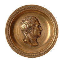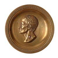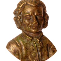- Applique de décoration en laiton pour un meuble de style, de forme ronde, bordure décorée d'une couronne (entrelas); au fond de la cuvette, buste de Rousseau, de profil à droite, nu tête, coiffure à la romaine, maintenu au fond de la cuvette par un rivet.