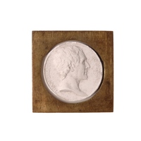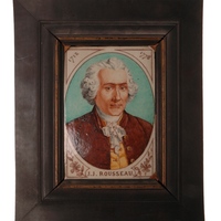 - Portrait peint sur faïence entouré d'un large cadre en bois noir. Rousseau est représenté de trois-quarts à droite, arborant un habit à la française à 3 boutons de couleur brune, un gilet jaune, un jabot de dentelle, et portant perruque.