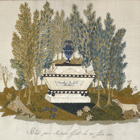 Technique: les visages et les mains ont été dessinés, le tronc du grand arbre, le banc de pierre, le sol, les vêtements sont faits de fil de soie. Ces pièces sont brodées sur un tissu, les feuillages sont en chenille. - id (dcterms:identifier)