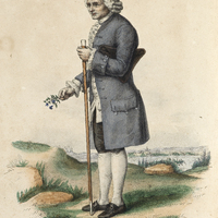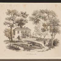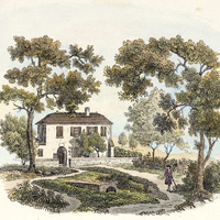 La maison des Charmettes, presque de face, entourées d'arbres. sous un ciel nuageux. Au centre, au premier plan,un soupirail. Sur le sentier, à droite, un homme qui se promène dont le chapeau en haut-de-forme de la gravure de Hamilton / Guyot (voir 92.5.52) est remplacé par un chapeau rond.