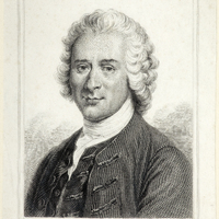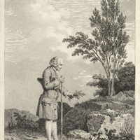 Portrait de Rousseau «herborisant dans la campagne au bord d'un étang. Il est représenté en pied, de profil à droite, son chapeau sous le bras droit; il s'appuie sur sa canne qu'il tient de la main droite; dans la main gauche, il tient un bouquet.