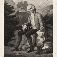 Portrait de Rousseau «représenté assis sur un rocher dans un paysage de montagnes. Il est tourné de trois-quarts à gauche, le visage presque de face. Il est tête nue, et porte le vêtement du Rousseau herborisant. A la main droite, il a son tricorne qu'il a posé sur sa cuisse. Sa canne est debout entre ses jambes. Le bras gauche pend. La main tient un manuscrit qui porte: Lettres de la Montagne.