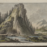 A gauche, un sapin; à dr. et à g. au deuxième plan, des rochers dénudés. A dr. derrière Rousseau, on voit un lac et un bourg sur la rive opposée.