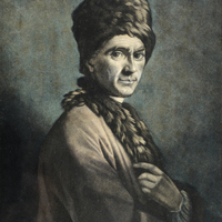 Portrait de Rousseau «assis à une petite table, tourné de trois-quarts à droite. Il porte l'habit d'arménien (toque à bord de fourrure, col de toile) [inspirée de La Tour/baron Gérard]. Il est en pantouffles. Ses bras reposent sur la table. Il tient une loupe dans la main droite, une plante dans l'autre. Des planches de botanique sont posées devant lui, ainsi qu'une plante fleurie. La table est couverte d'un tapis à frange. En face de lui son chien, debout, le regarde, la langue légèrement pendante, la queue relevée semble battre.