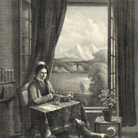 - «J. J. ROUSSEAU.» (en lettres grises) «Cette vue est prise de l'intérieur de la Chambre que Rousseau occupait en 1765, à l'Ile St. Pierre, sur le Lac de Bienne, en Suisse.» (en lettres anglaises) [sic]