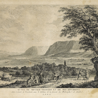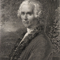 «Le portrait de Rousseau (tête nue, de profil à gauche [évoquant Vécharigi]) figure au cœur d'un tableau où l'artiste a évoqué des scènes tirées des œuvres principales du philosophe, et a dessiné le tombeau où il fut déposé.