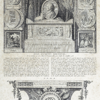Derrière le tombeau, dans un cadre, et formant un fond pour le médaillon un décor suggérant l'ìle des Peupliers. Le médaillon est flanqué (à g.) d'une brebis couchée sur le tombeau; (à dr.) d'une lasse de papiers. Un bâton passe derrière le médaillon et supporte un bonnet phrygien et une chaîne rompue qui pend sur le médaillon.