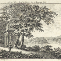 A gauche au premier plan, un arbre. Au second plan, une étendue d'eau. La rive opposée est couverte d'arbres et de buissons, derrière lesquels apparaissent (à g.) des champs et (à dr.) un hameau dominé par quatre peupliers. Au-delà des champs, une forêt, et, à l'arrière-plan s'élève une impressionnante chaîne de montagnes.