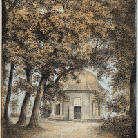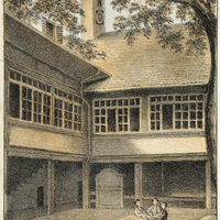 - «L'image représente un angle de la Cour de la Maison [du Receveur]. Au-dessus du toit le clocheton de la maison avec l'horloge. Tout à dr., le grand arbre qui se dresse au centre de la cour. Sous celui-ci, au premier plan, deux longues tables et des bancs avec trois personnages attablés devant leur repas.» (FM)