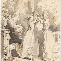 Maison de J.J. Rousseau à Môtiers, d'après Le Barbier [ou plutôt inspirée de la gravure de l'Helvetischer Kalender (carriole) (RK)].