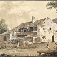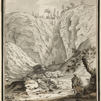 - «Cascade près de Môtier travers [sic] dans le Comté de Neufchatel» (titre manuscrit) en bas au verso, très petit cachet de collectionneur floral violet, inconnu des successeurs du Lugt (2010)