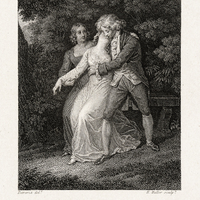 Couple embrassé dans un bocage près d'un banc, une femme à leur droite.