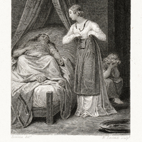 Une femme alitée, une autre s'attachant un tablier, tout à droite une fillette la tête entre les mains.