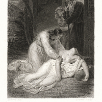 Un homme se penche sur une femme à terre la poitrine dénudée, sous les yeux effarés d'une femme et d'un vieillard.