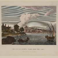 - Vue du Désert. Un personnage se tient à gauche de l'entrée de la cabane qui domine une colline de gros blocs. Quelques arbres y poussent. Sur la gauche, un petit personnage appuyé sur sa canne, accompagné d'une femme, s'apprête à la gravir. Sur la droite, trois personnages en redescendent. Au premier plan, le bord du lac où nagent des canards.