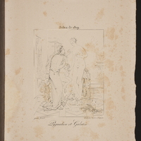 Pygmalion, de profil à droite, est incliné légèrement devant Galatée qui est sur un piédestal de trois-quarts à gauche. Il la regarde tandis qu'un amour, placé entre les deux, tâche de les unir. Décor de temple et sculptures grecs.