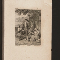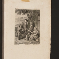 Le maître tient Emile [accroché à don bras droit]. Il fait l'aumône à un couple de miséreux avec leur enfant assis devant la porte d'une maison sous un arbre. Au fond paysage de montagnes.