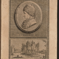 Portrait en buste de Jean-Jacques Rousseau de trois-quarts à gauche, tête nue, perruque ronde, en habit à la française dans un ovale placé (cadre carré avec macarons aux coins) sur une console dont le cartouche porte sa devise.