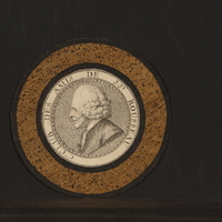 - Petit médaillon ovale représentant un buste de Rousseau en perruque, de trois-quarts tourné vers la droite.