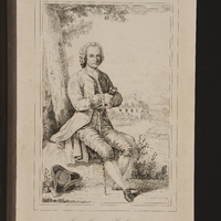 - Portrait de Rousseau en pied, tourné de trois-quarts à droite, assis sur un rocher à l'orée d'un bois. Il a posé à sa gauche son chapeau et sa canne; il tient un crayon de la main droite et de la gauche serre contre lui un carnet de notes. Le site domine un pays de collines où l'on voit quelques maisons et bosquets.