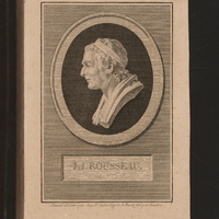 - Portrait de Rousseau en pied, tourné de trois-quarts à droite, assis sur un rocher à l'orée d'un bois. Il a posé à sa gauche son chapeau et sa canne; il tient un crayon de la main droite et de la gauche serre contre lui un carnet de notes. Le site domine un pays de collines où l'on voit quelques maisons et bosquets.