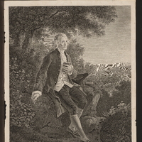 - Portrait de Rousseau en pied, tourné de trois-quarts à droite, assis sur un rocher à l'orée d'un bois. Il a posé à sa gauche son chapeau et sa canne; il tient un crayon de la main droite et de la gauche serre contre lui un carnet de notes. Le site domine un pays de collines où l'on voit quelques maisons et bosquets.