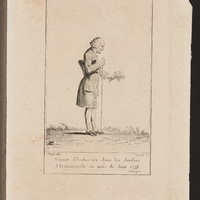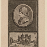 Portrait en buste de Rousseau, de profil à g., coiffé d'un bonnet de fourrure avec houppe retombante, dans un médaillon ovale. Au-dessous, un bas-relief représentant l'île des Peupliers avec le 1er tombeau (sans l'urne) à Ermenonville; le tout sur fond rectangulaire. La vieille femme est à droite, un mouton et une vache à gauche.