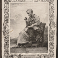- Portrait de Rousseau, en buste de trois-quarts tourné à droite, tête nue et perruque ronde, en habit à la française. Représenté dans une couronne de laurier attachée en bas par un nœud de ruban.