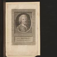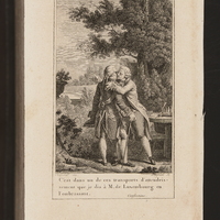 - Dans un parc, Jean-Jacques Rousseau embrasse le maréchal de Luxembourg en le serrant entre ses bras. Rousseau est tourné de trois-quarts sur sa droite, le maréchal est de dos, la tête tournée sur sa droite.