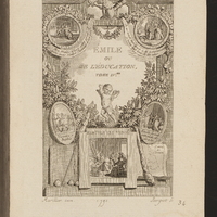 Au premier plan, le philosophe assis ä son bureau et brandissant la lettre «a tout / français / aimant / encore la / Justice et / la vérité», relit ses textes dans une attitude accablée. A gauche, deux enfants se dissimulent derrière une tenture. A droite, sur un piédestal, une femme avec un enfant dans les bras. [Sur le sol, partition de musique, planche de botanique ou d'herbier, Les Confessions. L'image déborde le trait carré.