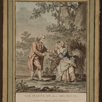 Portrait en buste de Jean-Jacques Rousseau, tête nue sans perruque, de trois-quarts à gauche, un portefeuille sous le bras gauche, dans un cadre ovale de feuilles de chêne serrées par un ruban qui s'achève en bas par un nœud. Fond d'arbres.