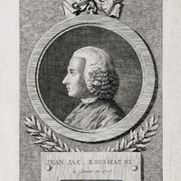 Portrait en buste de Jean-Jacques Rousseau de trois-quarts à gauche, tête nue, perruque ronde, en habit à la française dans un ovale placé (cadre carré avec macarons aux coins) sur une console dont le cartouche porte sa devise.