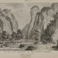 - «VUE D'UNE CASCADE DE MOUTIERS-TRAVERS / à peu de distance de la Maison de J.J. Rousseau. / Voyez les Nos 10. 37. 84, 96 et 144.» Tableaux de la Suisse «N° 233.»