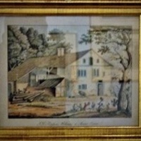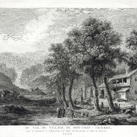 - «III.E VUE DU VILLAGE DE MOUTIERS ' TRAVERS, / avec la maison de J. J. Rousseau, et la Chute du Torrent qui est dans les environs. / A.P.D.R.» ["Tableaux de la Suisse", Laborde et Zurlauben, Paris, 1780, No 84]