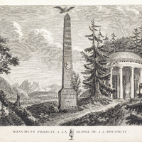 - «MONUMENT PROJETÉ A LA [ ] GLOIRE DE J.J. ROUSSEAU.» Au milieu de l'inscription est gravé un petit buste, de profil tourné à droite, d'après celui de Houdon.