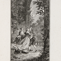 «un parc et près d'un bosquet en treillage, à [gauche], on aperçoit Julie, de profil à [droite], qui dans les bras de Saint-Preux l'embrasse; plus à [gauche] encore, de trois-quarts à [droite], se tient Claire.» (G2: p.28, 2e planche)