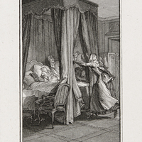 «à [gauche], un lit à rideaux et baldaquin; Claire et Julie sont couchées, l'une morte, l'autre évanouie. A [droite], une femme, au pied du lit, accourt les mains étendues. Derrière le lit, à la tête, on aperçoit M. de Wolmar en madras;à côté de lui, trois autres femmes pleurent.»(G2: p. 34, 13e planche)