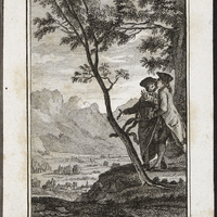 «Sur le haut d'une colline, on aperçoit, à [droite], Rousseau et le vicaire savoyard qui regardent à [gauche] le paysage qui s'étend à leurs pieds; le Pô et les Alpes dans le lointain.» (G2: p. 37, 5e planche)