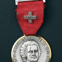 Revers: IIE CENTENAIRE | DE | JEAN-JACQUES | ROUSSEAU | CITOYEN DE GENEVE | 1712 | 28 juin | 1912. En haut à g.: armes de Genève dans un soleil flamboyant; en dessous: une pile de livres et une branche de laurier, couvertes par une feuille de papier portant les titres EMILE; HELOÏSE; CONTRAT SOCIAL; LETTRES | DE LA | MONTAGNE; CONFESSIONS, avec encrier et plume d'oie. Signé: A.JACOT GUILLARMOD: